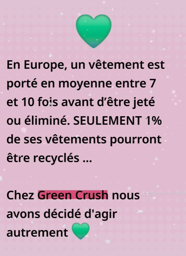 Chez Green Crush, nous agissons contre les déchets textiles. Nos vêtements sont choisis avec soin selon leur composition. En effet, grâce à celle-ci, tous nos articles pourront être recyclés en nouvelles fibres.